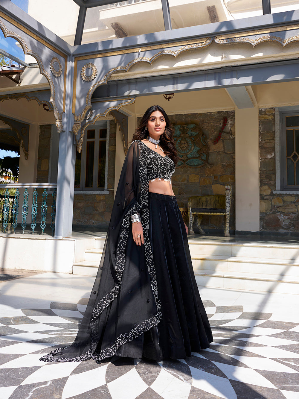 Black Color Pearl Coding And Sequins Embroidery Work With Satin Lehenga Choli