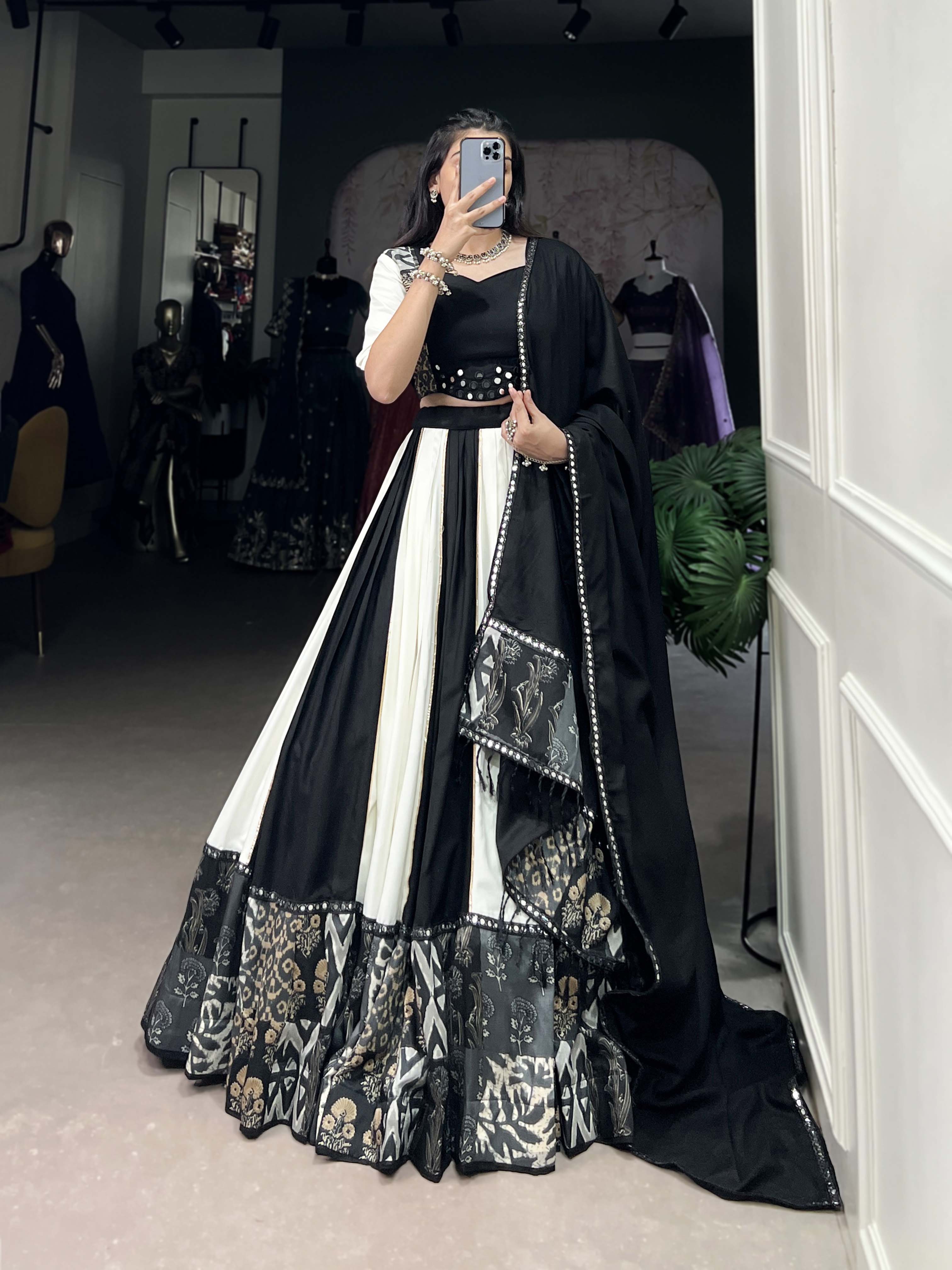 • Gorgeous black color lehenga choli is well crafted with high-quality rayon fabric and beautifully plain and printed paper mirror work.