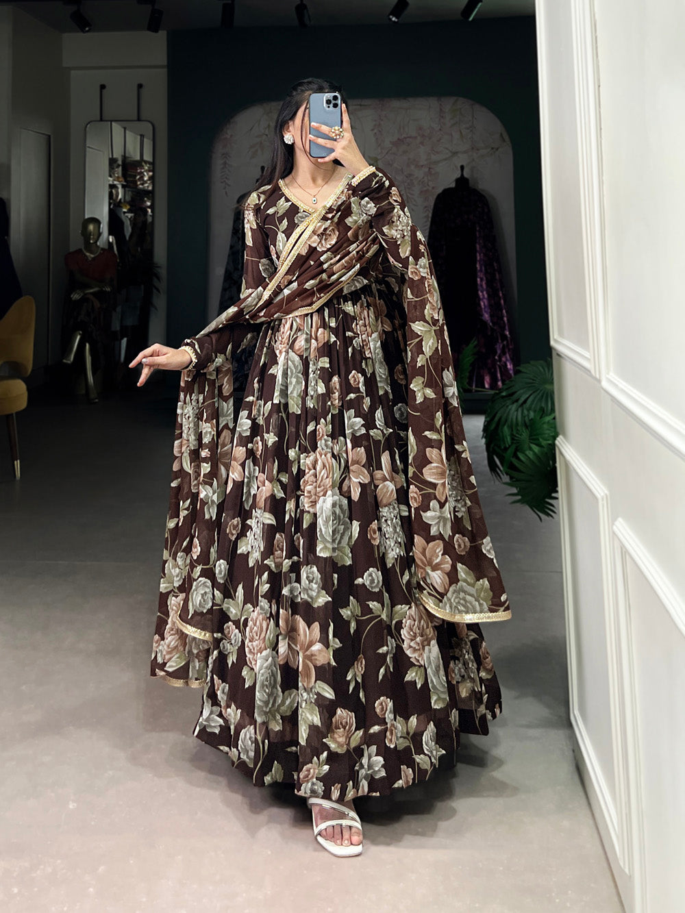 • Experience timeless elegance with this brown color marble fabric floral printed gown, crafted for effortless grace and style.