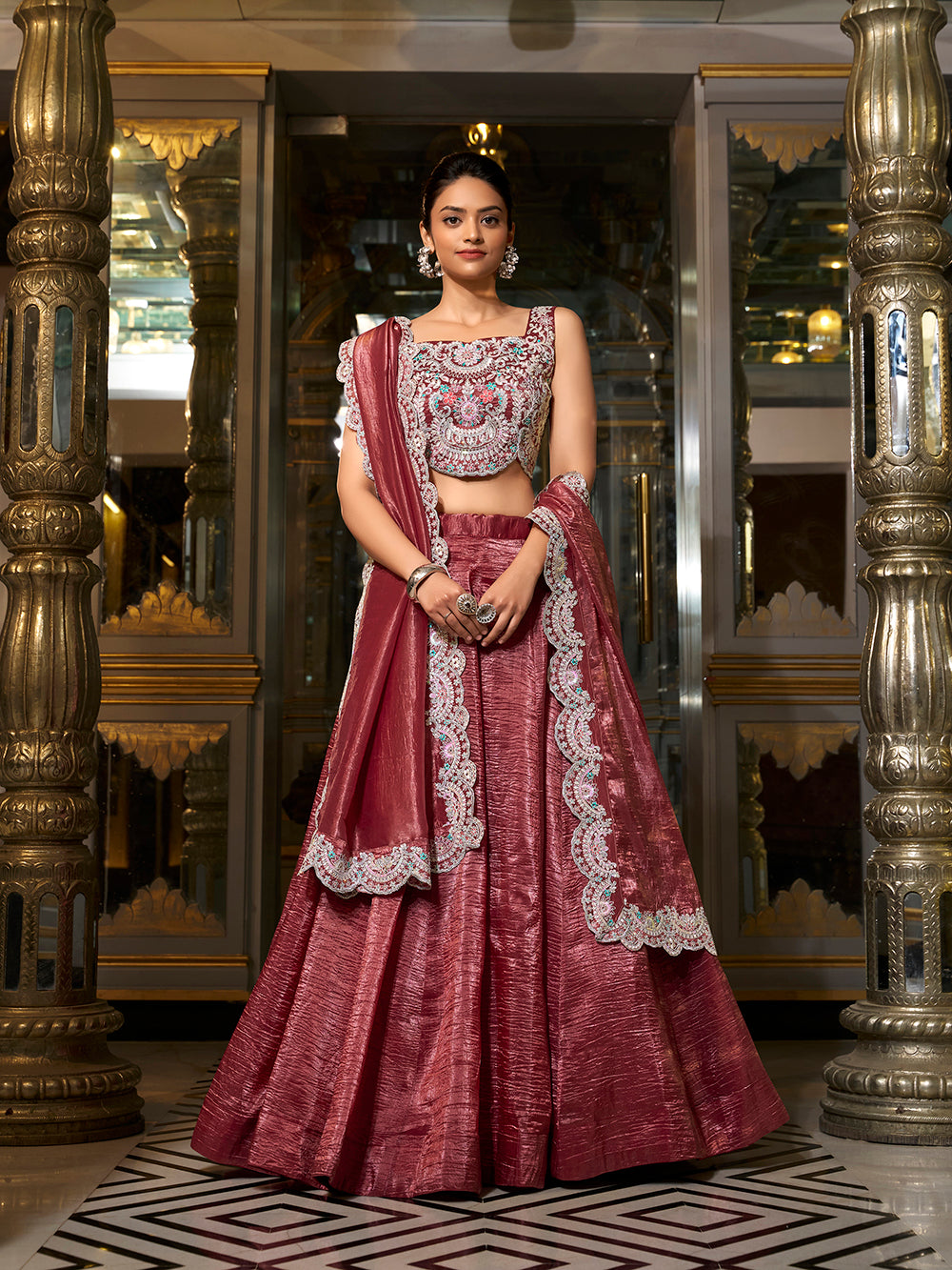 • This exquisite lehenga choli set is a perfect blend of opulence and tradition, crafted from crimson color gold crush with sequins and thread embroidery work.