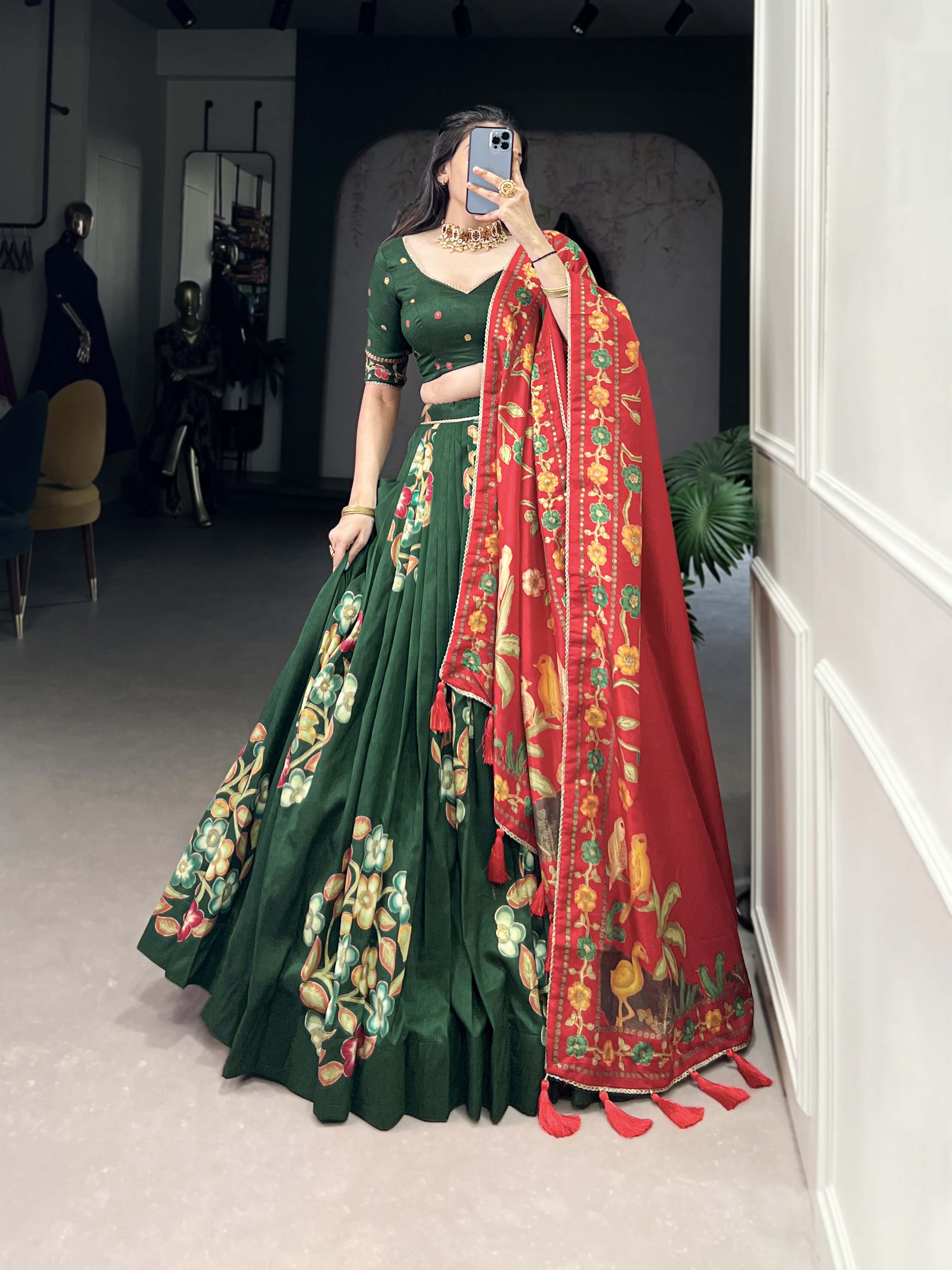 • The printed and foil work with lace touch up tussar silk green color lehenga choli is a masterpiece that blends artistic heritage with modern sophistication.