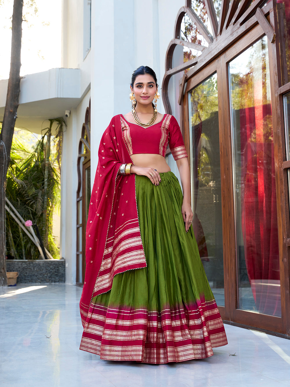 • A plain chanderi mehendi color lehenga choli with zari weaving work border is a traditional Indian ensemble that exudes elegance and sophistication.