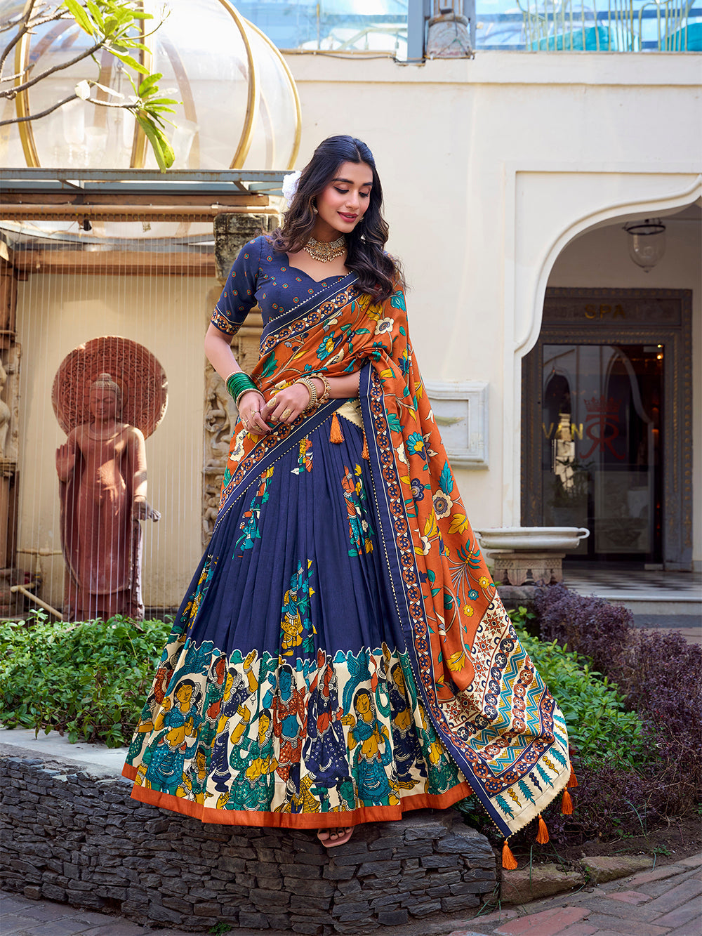 Navy Blue Color Kalamkari Print With Foil Work Tussar Silk Lehenga Choli