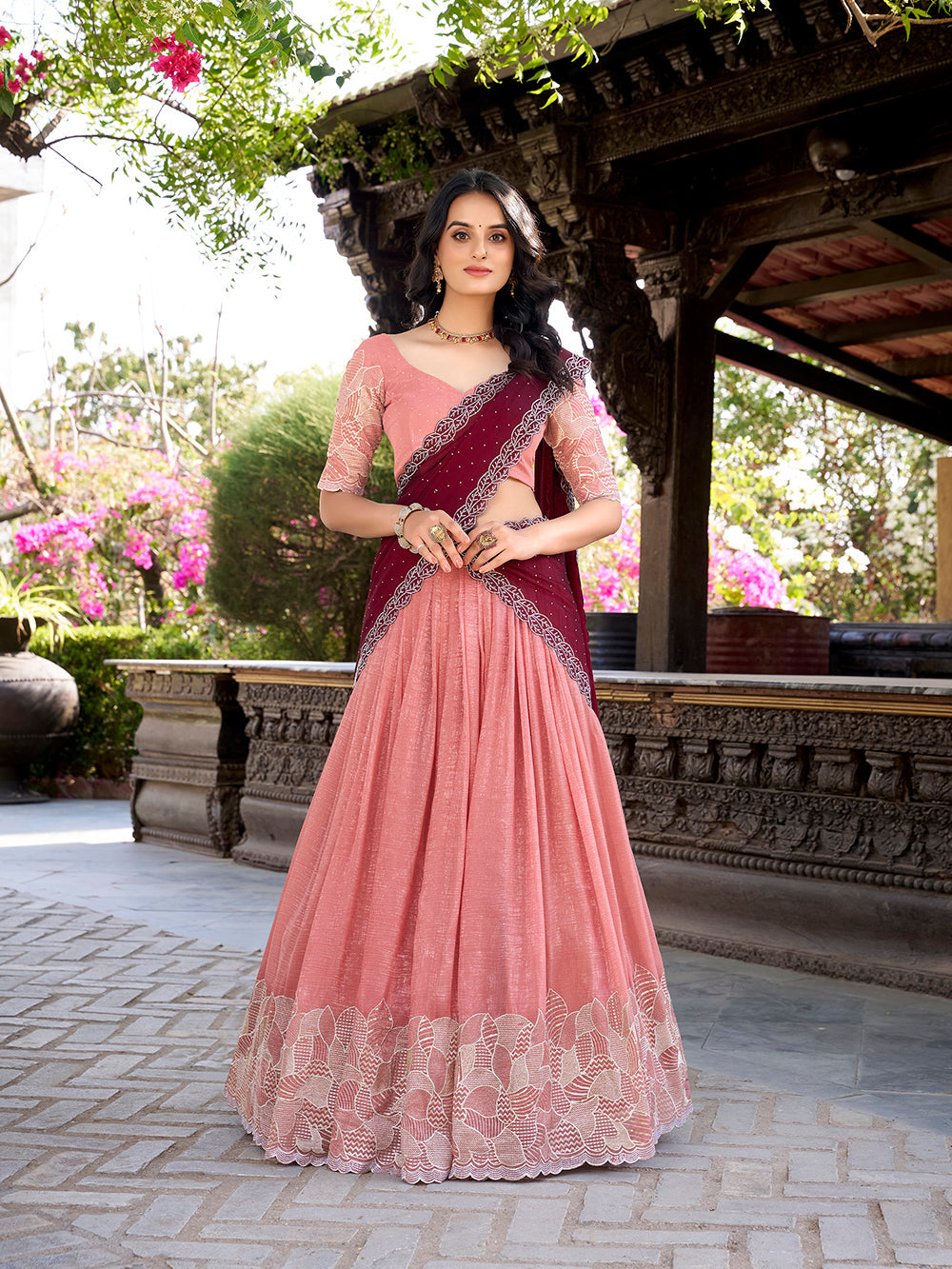 Peach Color Sequins And Embroidery Work With Hotfix Silver Glossy Lehenga Choli