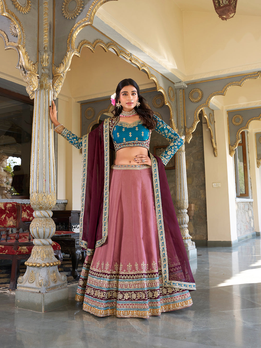 Peach Color Sequins And Thread Embroidery Work Moonga Silk Lehenga Choli