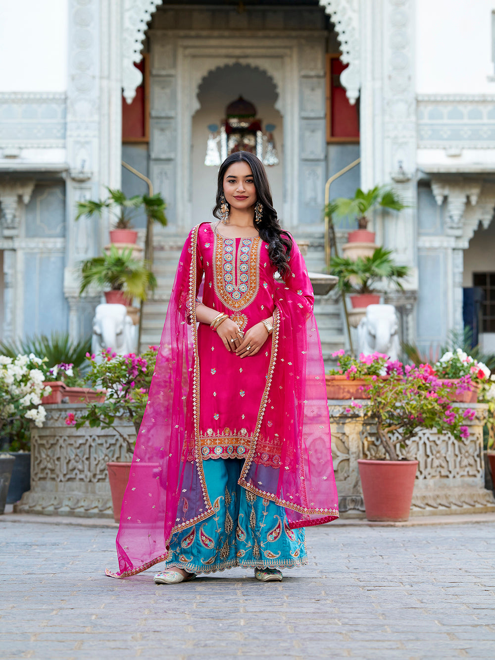 • Step into a world of elegance with this pink color sequins and thread embroidery work moonga silk salwar suit.