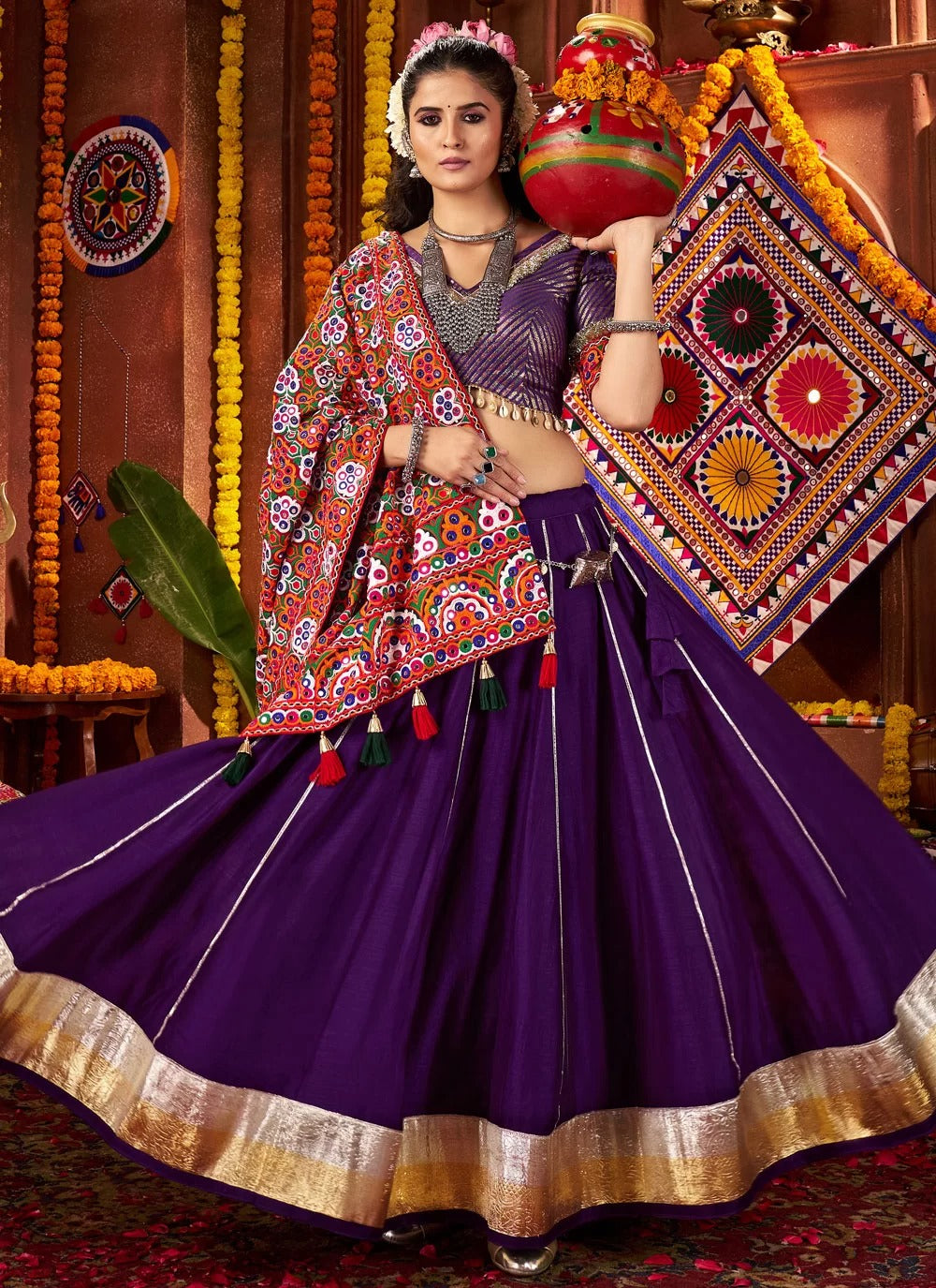 Channel the rich traditions of Gujarat with this purple Bandhani-inspired traditional lehenga choli, designed especially for Navratri festivities. This ensemble blends timeless elegance with mirror sparkle to keep your twirl game on point!