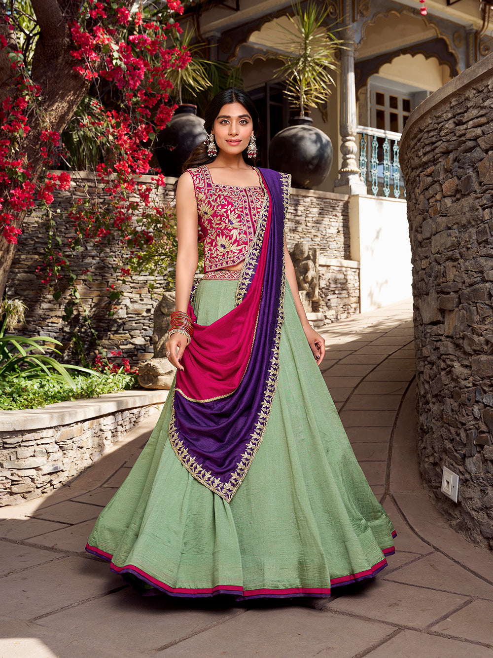 • Crafted from a luxurious vichitra silk fabric, the lehenga features a soft, see green hue with a subtle sheen, adding a touch of elegance.