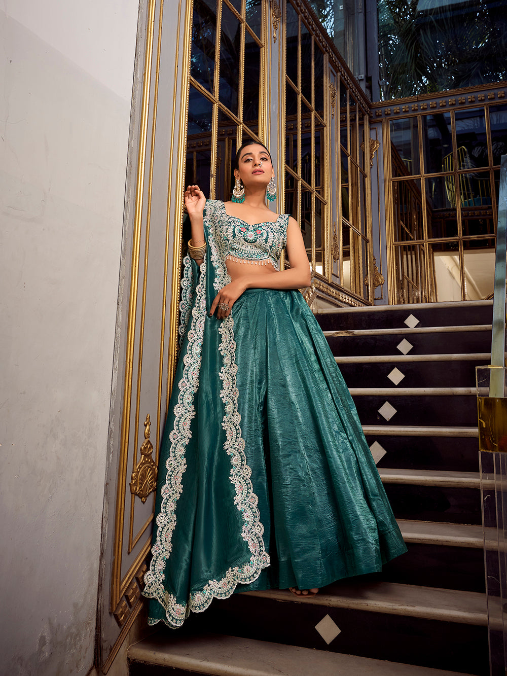 • This exquisite lehenga choli set is a perfect blend of opulence and tradition, crafted from teal color gold crush with sequins and thread embroidery work.