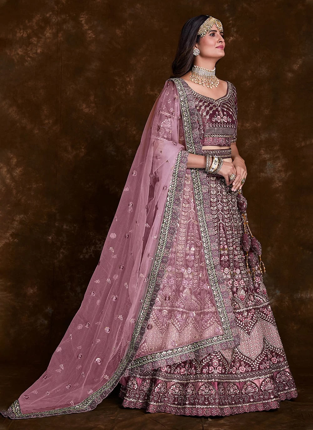 Look like a princess on your special day with this beautiful Wine Art Silk Thread, Zari, Sequins & Zarkan Work Bridal Lehenga. Crafted with Art Silk fabric, this Lehenga is ideal for memorable occasions and features intricate Thread, Zari, Sequins & Zarkan work. The Soft Net dupatta and fitted Art Silk blouse complete the look.