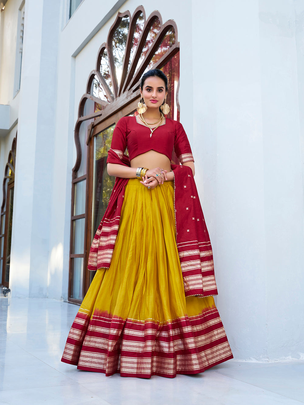 • A plain chanderi yellow color lehenga choli with zari weaving work border is a traditional Indian ensemble that exudes elegance and sophistication.